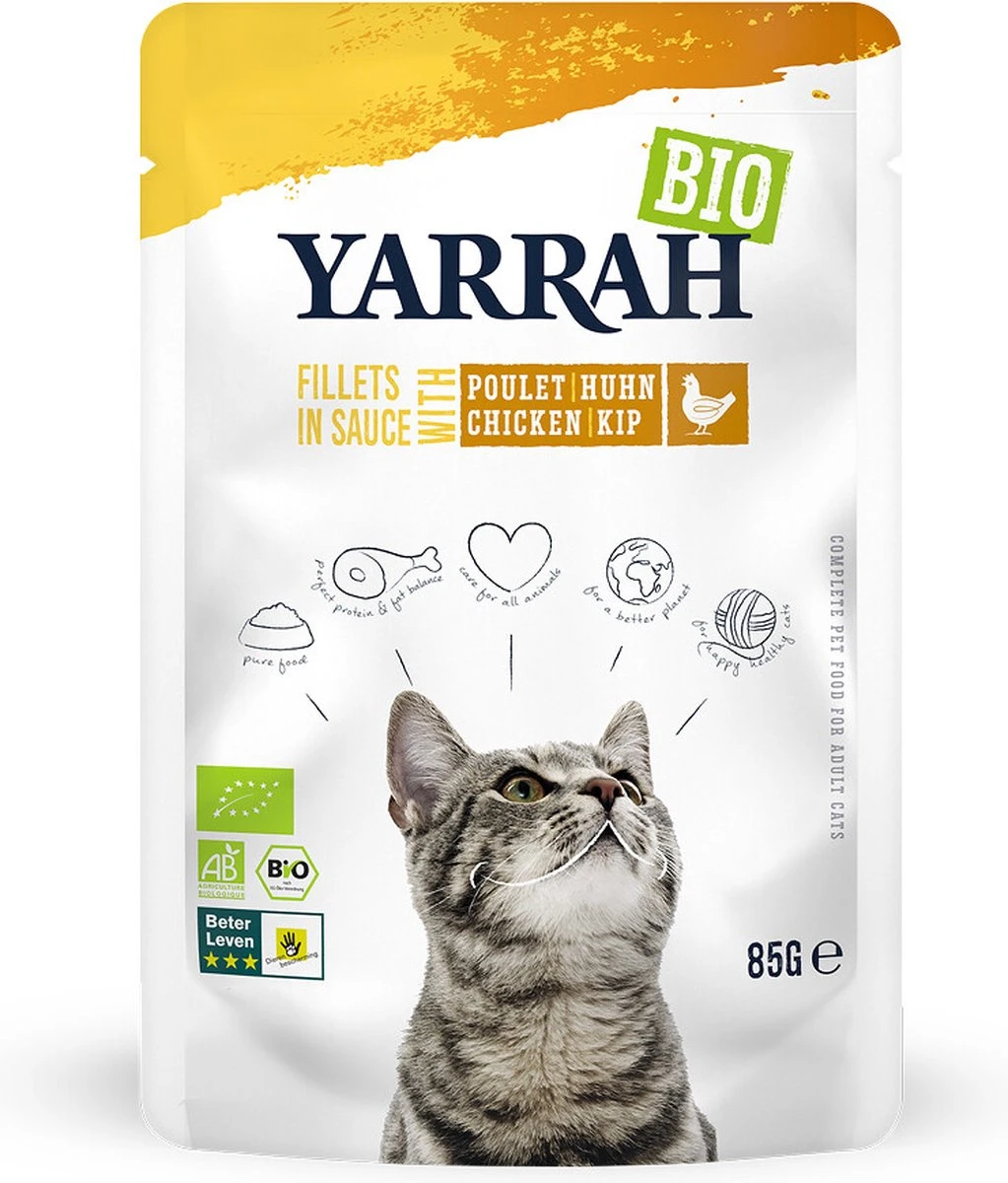 Yarrah Bio Cat Pouch β Chicken in Gravy is een biologisch natvoer van filets in saus met kip, voor alle volwassen katten. Dit smakelijke voer vormt een complete maaltijd zonder chemische geur-, kleur- en smaakstoffen, pesticiden en GMO. Je kat krijgt enkel binnen wat hij nodig heeft.