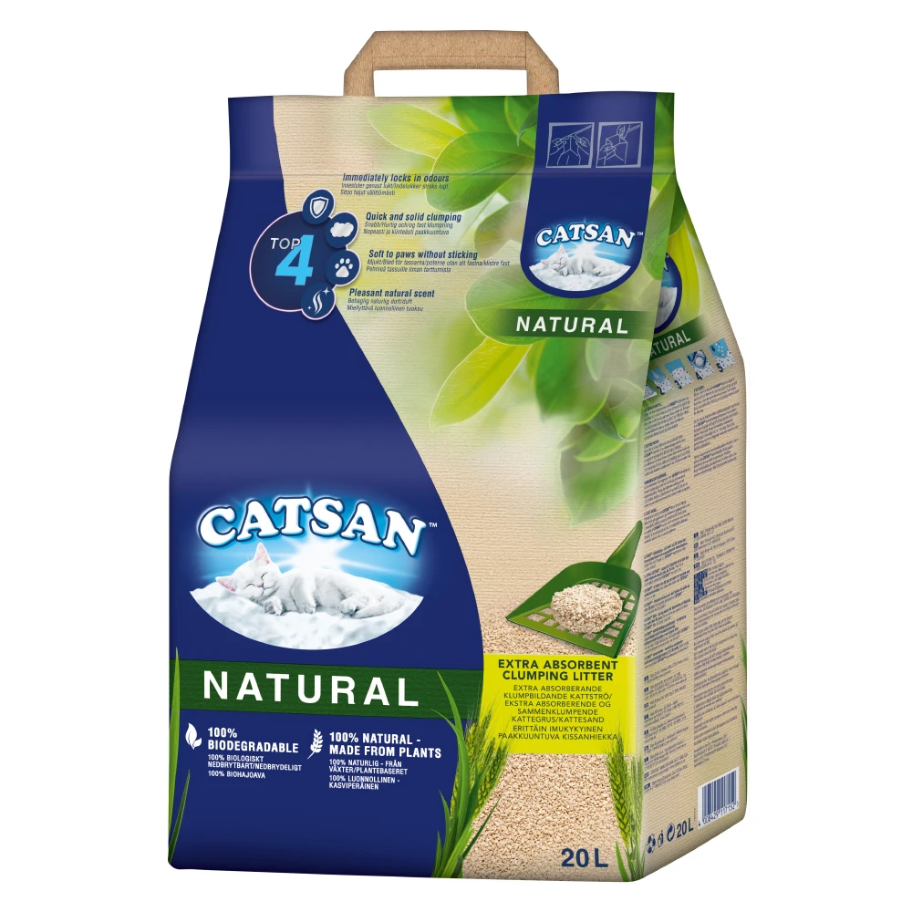 Hygiëne zonder kunstmatige geurstoffen en toevoegingen: met Catsan Natural haal je een absorberend kattenbakvulling in huis die volledig gemaakt is van natuurlijke grondstoffen en van de kattenbak een schoon, goed ruikend plekje voor jouw katje maakt. Bij Catsan Natural gaat het om een extra absorberende klonterende kattengrit die gemaakt is van 100% plantaardige vezels. Het is ideaal geschikt voor iedereen die om het milieu geeft aangezien het grit volledig biologisch afbreekbaar is. Je kat en jij zelf profiteren van de sterke geurbindende eigenschap van het natuurlijk gekleurde strooisel. Onaangename geuren worden direct opgevangen en bovendien vormt het strooisel snel vaste klonten zodra je kat zijn boodschap heeft nagelaten. De klonten zijn makkelijk met een kattenbakschepje te verwijderen zodat de kattenbak weer snel schoon is. Katten houden van netheid en houden – zowel mannetjes als vrouwtjes – niet alleen van een beetje extra hygiëne in de kattenbak, maar ook van de natuurlijke geur van het strooisel. Catsan Natural overtuigt met een aangename textuur: de korrels zijn zeer zacht en vriendelijk voor de poten. Catsan Natural in één oogopslag: Klonterend strooisel voor de kattenbak 100% natuurlijk: gemaakt van plantaardige vezels 100% biologisch afbreekbaar: kan worden weggegooid in het groenafval Extra absorberend: snelle binding van vaste klonten, eenvoudig te verwijderen Tegen onaangename geuren: aangename natuurlijke geur, strooisel bindt slechte geuren direct Zachte textuur: aangenaam voor kattenpoten Inhoud: 8 liter