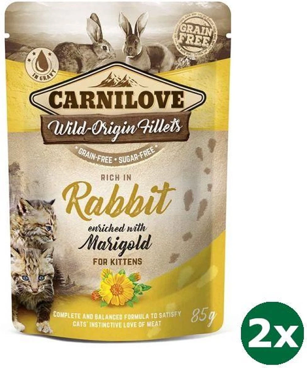 Carnilove Pouch Rabbit 24X85 grDe Carnilove Pouch Rabbit 24X85 gr is een volledig natvoer kattenvoeding, graanvrij en zonder aardappel met een bijzondere vleesbron en hoge verteerbaarheid. Konijnenvlees is goed verteerbaar en voedzaam. Het kan de gezondheid van het spijverteringskanaal ondersteunen. Het zeer lage vetgehalte kan helpen de algehele conditie te behouden. Goudsbloem heeft ontstekingsremmende eigenschappen en kan een gunstige invloed hebben op de huid, vacht, gewrichten en het hart. Heerlijk als volledige voeding of als toevoeging over de brokken.- Natvoer van Carnilove- Met bijzondere vleesbron- Graanvrij en zonder aardappel- Met konijn met goudsbloemInhoud: 24X85 gramSamenstelling: 85% vleesfilets (71% kip, 14% konijn), 12% bouillon, 1% goudsbloem, 1% lijnzaadolie, 0,5% mineralen, 0,5% plantaardig zetmeelAnalytische bestanddelen: Ruw eiwit 9,5%, ruw vet 4,5%, ruwe celstof 0,5%, ruwe