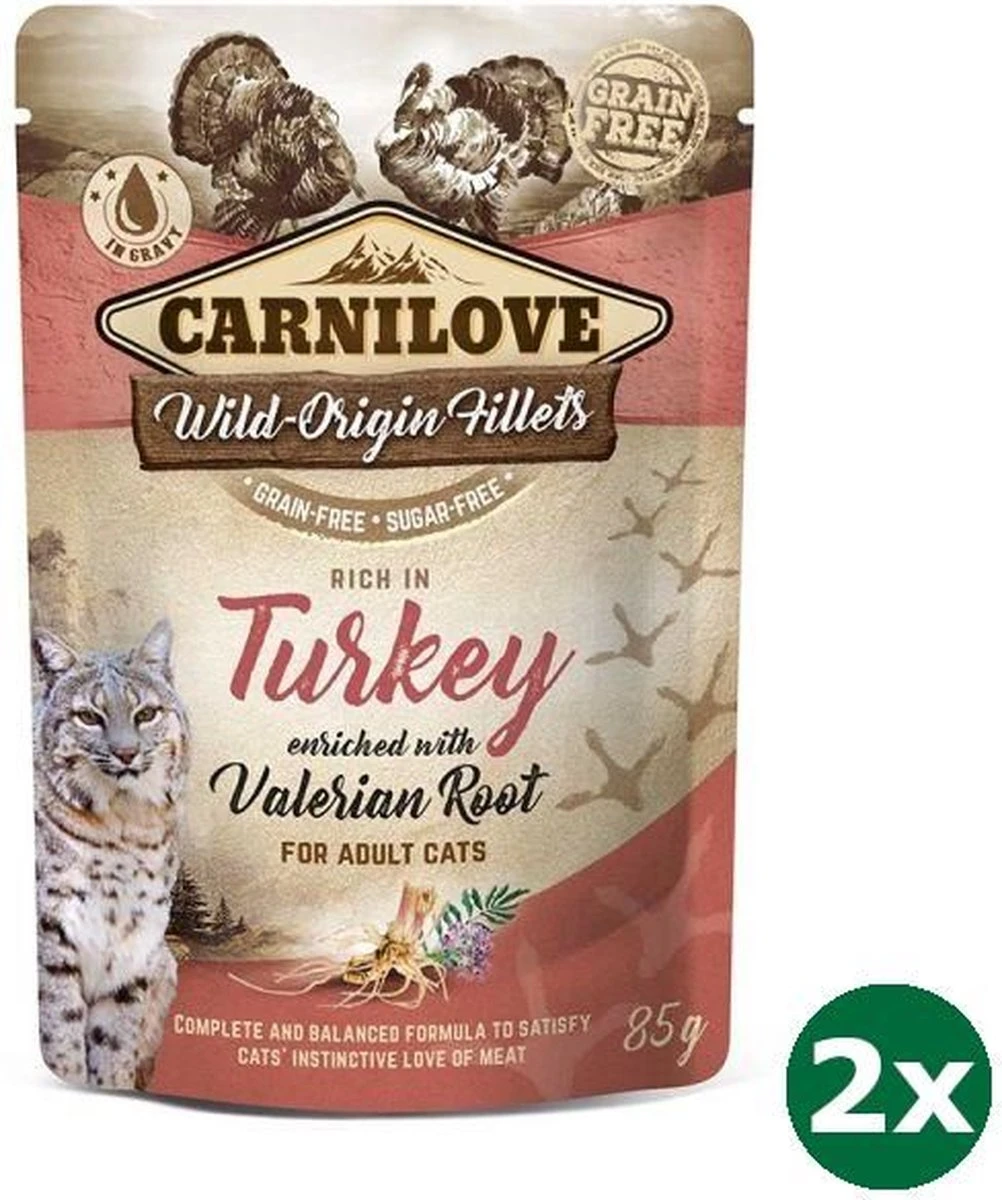 Carnilove Pouch Turkey 24X85 grDe Carnilove Pouch Turkey 24X85 gr is een volledig hypoallergeen natvoer kattenvoeding, graanvrij en zonder aardappel met een bijzondere vleesbron en hoge verteerbaarheid. Kalkoenvlees kan een optimale lichamelijke conditie en spierontwikkeling ondersteunen. Het hoge gehalte aan tryptofaan kan helpen stress te verminderen. Ook valeriaan draagt bij aan het voorkomen van stress en kalmeert het zenuwstelsel. Heerlijk als volledige voeding of als toevoeging over de brokken.- Natvoer van Carnilove- Met bijzondere vleesbron- Graanvrij en zonder aardappel- Met kalkoen en valeriaanInhoud: 24X85 gramSamenstelling: 85% vleesfilets (71% kip, 14% kalkoen), 12% bouillon, 1% valeriaanwortel, 1% lijnzaadolie, 0,5% mineralen, 0,5% plantaardig zetmeelAnalytische bestanddelen: Ruw eiwit 9,0%, ruw vet 4,0%, ruwe celstof 0,5%, ruwe as 2,5%, vocht 82,0%, calcium 0,15%, fosfor 0,2%, natri