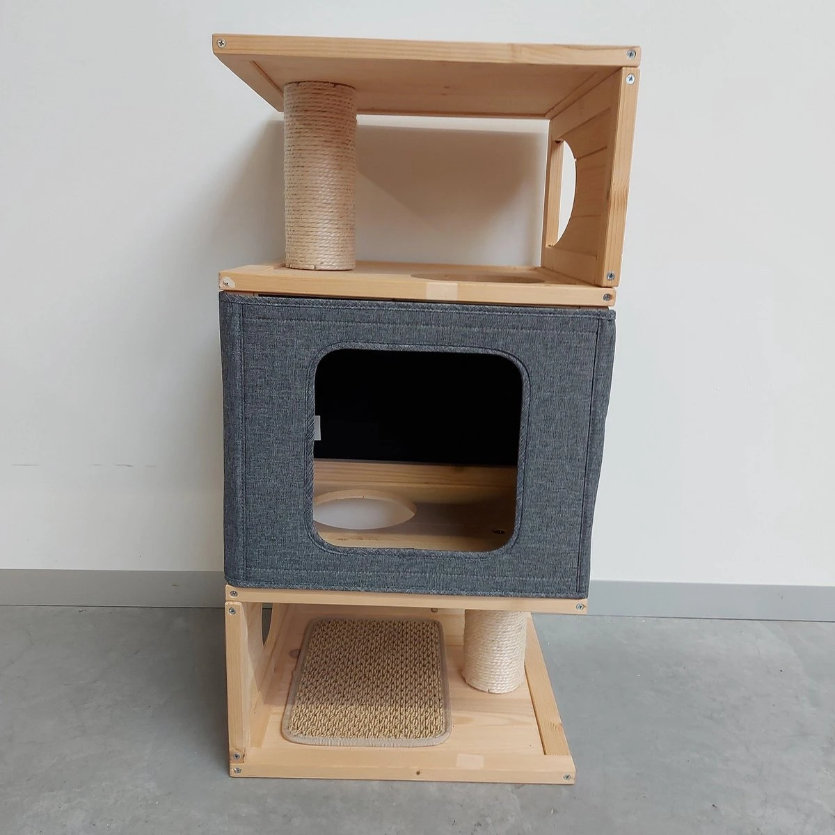 Kennel design krbpaal in driee verdiepingen waarvan de middenste met stof bedekt is, de andere twee zijn uit hout gemaakt. Onderaan en bovenaan is er een krabpaal voorzien.