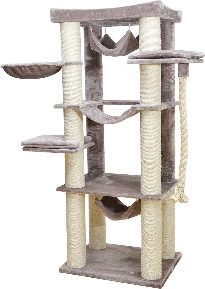 De EBI krabpaal Cambridge is een pluche krabpaal van maar liefst 197 cm hoog dat staat als een huis. Zijn brede opstelling, bestaande uit 4 krabstammen met een diameter van 15 cm, maakt het geheel super stabiel. In de vier hangmatten kan je kat heerlijk uitrusten. Deze krabpaal is geschikt voor grote en actieve katten of gezinnen met meerdere katten. Het extra dikke speeltouw maakt de paal compleet