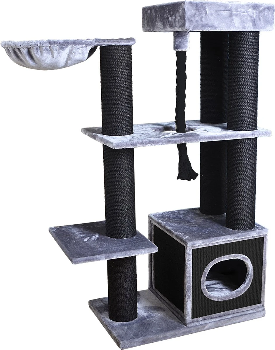 De EBI krabpaal Leicester is een pluche krabpaal van 159 cm hoog dat staat als een huis. Zijn brede opstelling, bestaande uit brede krabstammen van maar liefst 15 cm dik, maakt het geheel super stabiel. De krabpaal heeft alles wat een kattenhart begeert: een stevige ondergrond, brede sisal palen, een comfortabel schuilhuisje met uitneembaar kussentje, een hoge hangmat, een hoge ligmand en een extra dik speeltouw. Deze krabpaal is geschikt voor grote en actieve katten of gezinnen met meerdere katten.