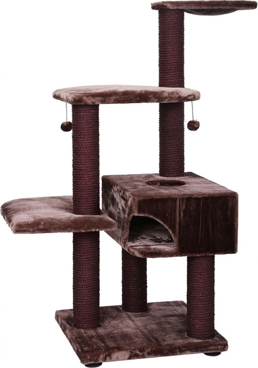 De Yosemite Valley krab paal is van alle gemakken voorzien. Op de eerste verdieping zit een slaaphuisje waar jouw kat lekker tot rust kan komen terwijl hij ligt op zijdezacht pluche. Daarnaast heeft de krabpaal nog 2 plateaus. Op de bovenste verdieping zit nog een hangmat waar de kat heerlijk in kan liggen en de boel kan overzien. Aan het tweede plateau hangen twee balletjes waar de katten lekker mee kunnen spelen als ze klaar zijn met hun dutje. De palen zijn voorzien van circa 1 centimeter dik sisal. Sisal is een natuurlijke en robuuste vezel waaraan de katten hun nagels kunnen scherpen. Zo krijgen ze geen ingegroeide nagels en beginnen ze ook niet te krabben aan jouw meubels.