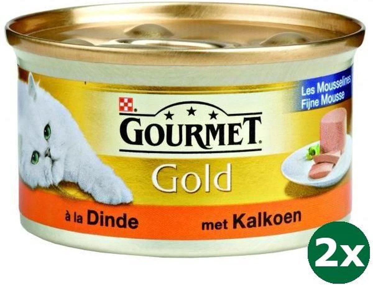Herkenbaar aan de gouden blikjes, biedt Gourmet Gold Mousse een assortiment van acht overheerlijke smaken. Het zijn allemaal hoogwaardige recepten speciaal bereid voor uw kat. Gourmet Gold Kalkoen is een volledige, complete diervoeding in de vorm van een mousse voor volwassen katten.Samenstelling: Vlees en dierlijke bijproducten (waarvan kalkoen 4%), Mineralen, Plantaardige bijproducten, SuikerAnalytische bestanddelen: Vocht: 77,5%; Eiwit: 10,5%; Vetgehalte: 7,0%; Ruwe as: 3,2%; Ruwe celstof: 0,05%.Toevoegingsmiddelen: Nutritionele toevoegingsmiddelen: IE/kg: Vit. A: 900; Vit. D3: 140; mg/kg: IJzer(II)sulfaat-monohydraat: 31,6; Calciumjodaat, watervrij: 0,40; Koper(II)sulfaat- pentahydraat: 3,5; Mangaan(II)sulfaat-monohydraat: 6,2; Zinksulfaat-monohydraat: 51Conserveermiddelen.Voedingsadvies voor een gemiddelde volwassen kat (4kg)