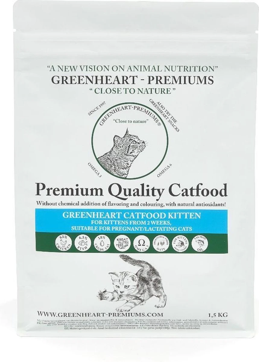 Greenheart kattenvoer kitten 10 kg. Een licht verteerbare kittenvoeding op basis van kip. Speciaal voor kittens vanaf ongeveer vier weken als ze hun eerste vaste brokjes kunnen eten; tevens uitstekend geschikt voor drachtige en zogende katten. Voor kittens van ongeveer 2 weken. Rijk aan vlees en verteerbare voedingsvezels. Tarwe glutenvrij! IngrediΓ«nten (rehydratie): Recept: 63% Kip, rijst, haver, kippenvet, vis, erwten, aardappel, bieten, johannesbroodmeel, zalmolie, appel, lijnzaadolie, kippenlever. Voedingsadvies Voor de overgangsfase kunt u eventueel de kittenvoeding wat aanlengen met kittenmelk.Gebruik altijd een RVS voerbak i.v.m. hygiΓ«ne!