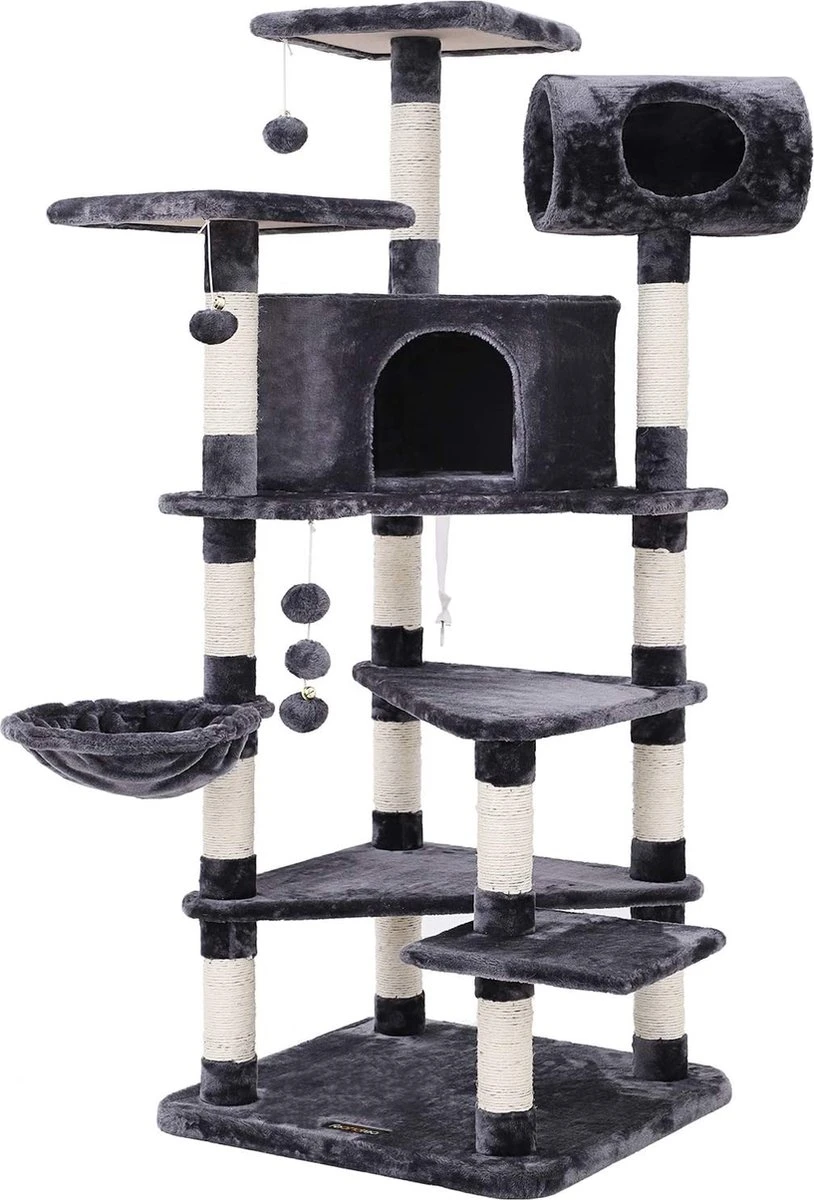 β’ Helemaal ontspannen β Zelfs veeleisende katten kunnen hun eigen plekje vinden in de klimboom met luxe kattengrot en zachte, knuffelende borden
