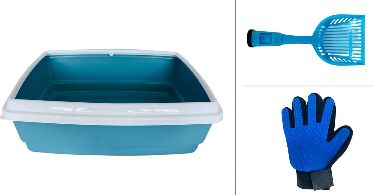 Pakket met handige kattenbak, kattenbakschep & 20 wegwerpzakjes & vachtverzorgingshandschoen