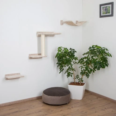 Krabpaal Wall Zugspitze Met deze Kerbl kattenklimwand Zugspitze kun je een aantal hogere plekjes creΓ«ren waar je katten hun omgeving goed in de gaten kunnen houden en kunnen spelen en chillen. Dit 5-delige klimwandsysteem biedt je kat of katten veel vrije ruimte om te spelen, zelfs in krappe ruimtes of appartementen. Van de 5-delige startset tot de complete 9-delige wandoplossing, dit kattenklimsysteem voldoet aan de behoeften van elke kat. De set wordt geleverd met de benodigde wandmontagematerialen en montage-instructies.