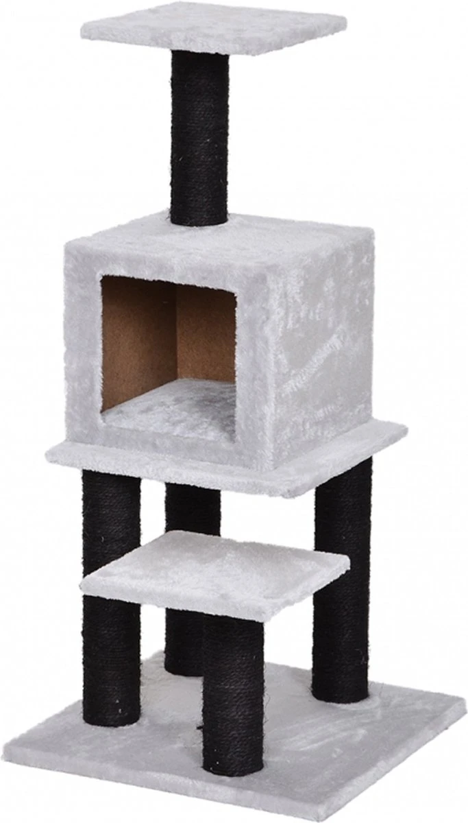 De krabpaal Angèle Grijs is een krabpaal die goed in een modern interieur past. Daarnaast is de krabpaal ook uiterst comfortabel voor jouw kat, want de krabpaal is uitgerust met heerlijk zachte pluche. Jouw kat kan lekker klimmen en klauteren in de krabpaal en helemaal bovenin zit nog een plateau, waar jouw kat kan plaatsnemen om de boel goed te overzien. De krabpaal bevat ook nog een kattenhuisje waar jouw kat lekker kan rusten of slapen. De palen van de krabpaal zijn uitgerust met sisal. Het sisal waar de katten aan kunnen krabben is van nature een tropische, robuuste vezel. Het is belangrijk dat katten hun nagels kunnen aanscherpen. Dit voorkomt dat hun nagels ingroeien. Bijkomend voordeel is ook dat ze niet gaan krabben aan jouw meubels.