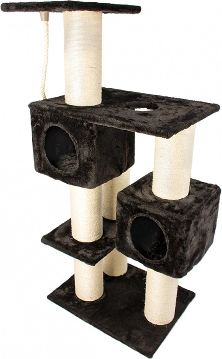 Met deze luxueuze krabpaal kan jouw kat heerlijk klimmen, relaxen en spelen. Door de meerdere plateaus en slaaphollen kan jouw kat zelf de gewenste hoogte uitkiezen om over de kamer uit te kijken. Aan รฉรฉn plateau zit een speeltouw, en in het andere plateau zit een gat waardoor er ook uitgebreid gespeeld kan worden. Daarnaast heeft deze krabpaal twee fijne kattenhuizen, waarin de kat zich lekker terug kan trekken. Met behulp van de verscheidene sisalpalen wordt ook zeker in de krabbehoefte voorzien. Door de dikte van de palen (namelijk 14 centimeter) is deze krabpaal ook geschikt voor grotere katten!