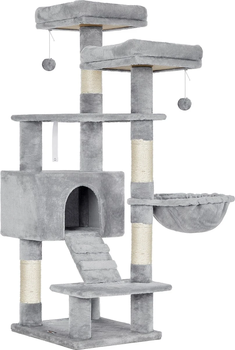 Deze medium krabpaal met diverse krabgedeeltes, mandjes en verstopplekken is een ware droom voor je kat(ten). De krabpaal is grijs van kleur, 142 cm hoog, voorzien van anti omval systeem en afgewerkt met zachte pluche.