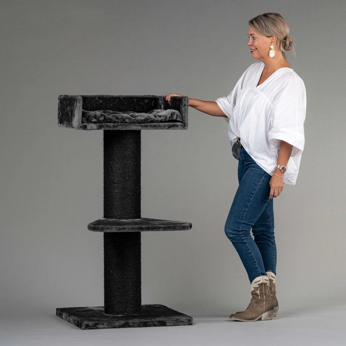 Krabpaal voor grote katten Maine Coon Lounge Blackline donker grijs is zeer stabiel met zijn 20cm diameter dikke sisalpalen en verzwaarde bodemplaat van 60×60 en 4,5cm dik. Met enorme ligplek met uitneembaar kussen.