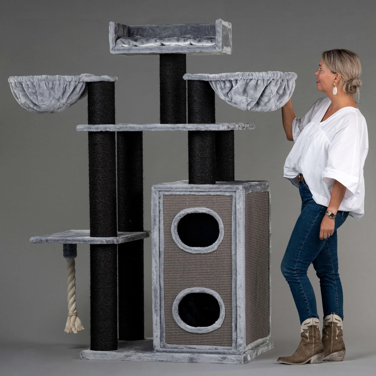 Alle plateaus zijn volledige gestoffeerd met heerlijk, dik en zacht 600 g pluche wat maakt dat elk plateau een geweldige plek is om te spelen, relaxen of slapen. Door de hoogte van bijna 1,85 meter is het voor uw katten natuurlijk geweldig om vanuit daar hun domein in de gaten te kunnen houden.