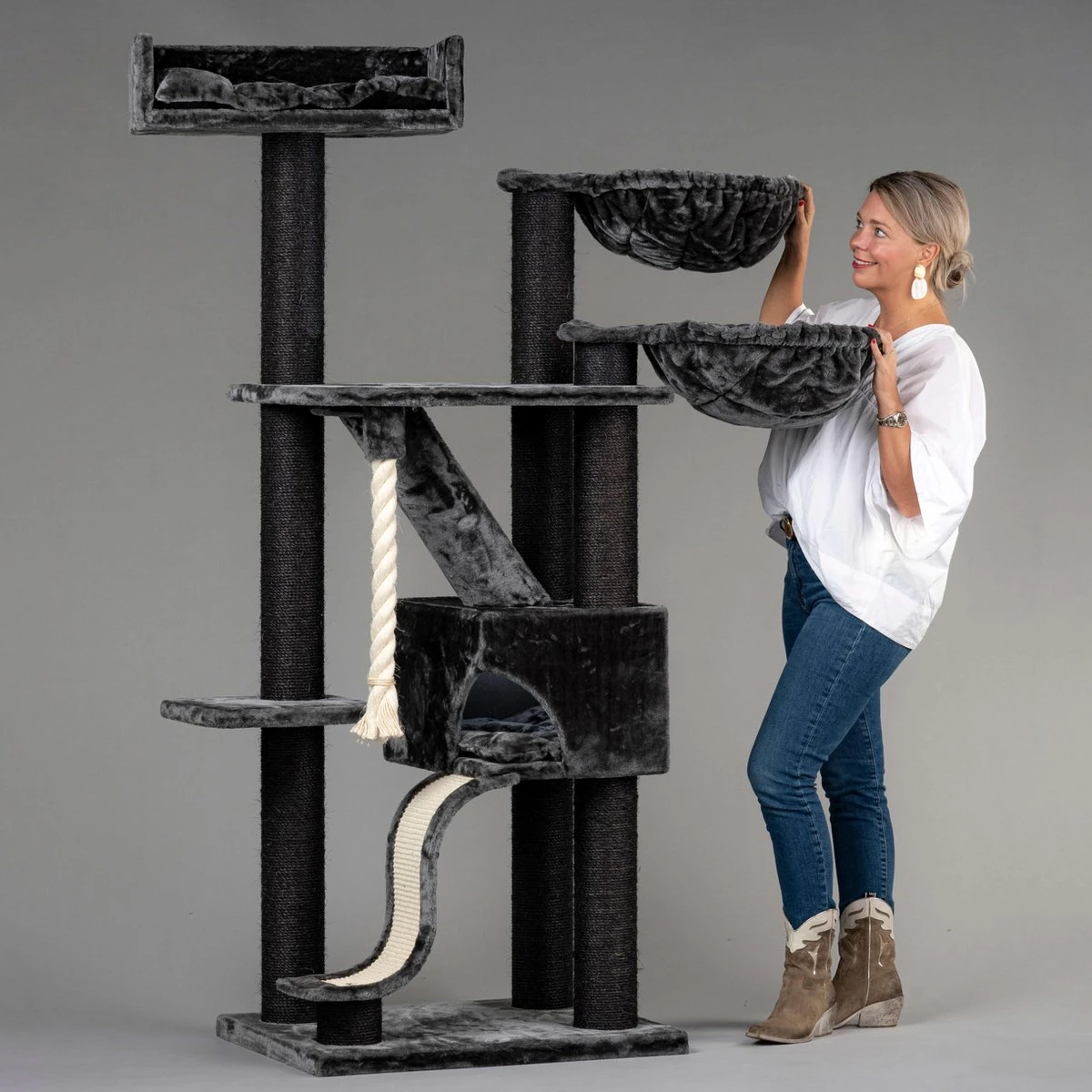 Krabpaal voor grote katten Kilimandjaro de luxe Plus donker grijs is met ca 50KG een zeer stevige RHRQuality krabpaal met extra dikke 12cm diameter sisalpalen met alles wat een kat zich kan wensen.