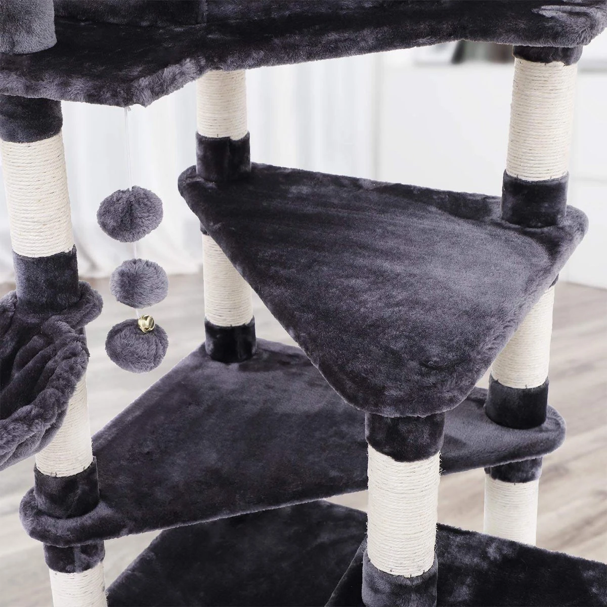 De kattenkrabpaal combineert hoge kwaliteit en veelzijdigheid, biedt dankzij de bodemplaat van hoogwaardig spaanplaat verschillende speelplekken en speelgoed. Alle palen zijn omwikkeld met sisal zodat uw katten er naar hartelust aan kunnen krabben. De luxe kattengrot biedt een grote ongestoorde rustplaats. Bovendien kunnen de ballen uw katten veel plezier bezorgen. Met de robuuste bodemplaat en de meegeleverde anti-kantelband overtuigt de krabpaal door zijn stabiliteit en duurzaamheid. Met de krabpaal kunnen uw katten thuis het plezier van het in bomen klimmen beleven.