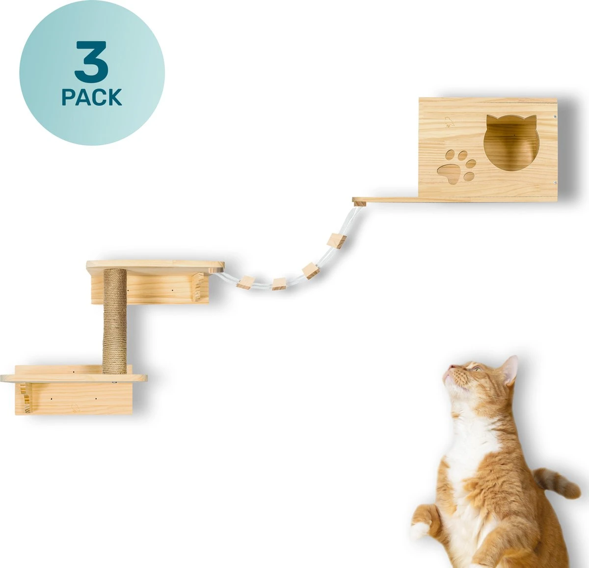 De klimwand bestaat uit een krabpaal, ladder en een fijn, rustig plekje zodat jouw kat heerlijk kan spelen én ontspannen. De bevestiging van de set gaat zeer eenvoudig en kan op een gewenste plek geplaatst worden. De elementen kun je op verschillende manieren bevestigen zodat jij zelf de indeling kan bepalen. Zo kun jij ervoor kiezen om de ladders en muurplanken eens in de zoveel tijd te wisselen voor een ander aanzicht.