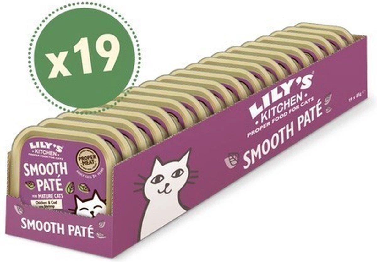 Lily’s Kitchen Cat Mature Cod / Chicken Pate 19×85 grDe Lily’s Kitchen Cat Mature Cod / Chicken Pate 19×85 gr is graanvrij, compleet kattenvoer voor katten vanaf zeven jaar en ouder, met natuurlijke ingrediënten in een romige pate. Deze heerlijke, volledige maaltijd voor volwassen katten vanaf zeven jaar is gemaakt van natuurlijke en verse ingrediënten. Dit voer geeft de ideale ondersteuning tijdens de pensioenjaren van jouw pluizige vriendje. Alle vitaminen en mineralen die jouw kat nodig heeft, zitten in deze maaltijd. Het recept is graanvrij en zonder toegevoegde suikers. Een feestje in het etensbakje!- Compleet kattenvoer voor katten van zeven jaar en ouder- Een romige pate met natuurlijke ingrediënten- Graanvrij en zonder toegevoegde suikersInhoud: 19 x 85 grSamenstelling: 22% Kip, Vis 19% (14% Kabeljauw, 5% Garnalen), 19% Varkensvlees, Mineralen, Zalmolie,