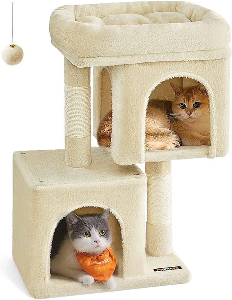 - 2 Huisjes: De dubbele opening maakt de bovenste grot de perfecte kijkplek en ook gemakkelijk toegankelijk. De onderste eendeurs grot biedt een rustige slaapplek en is ook geschikt voor kleine katten die nog niet goed kunnen springen.
