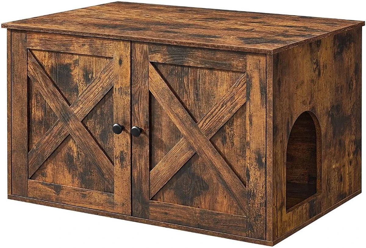 Met een rustieke afwerking en unieke schuurdeuren past deze kattenbakbehuizing gemakkelijk in de meeste woonstijlen, waardoor een doorn in het oog een blikvanger wordt.