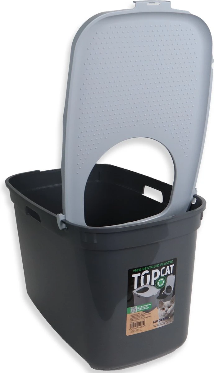 Het kattentoilet Top Cat is een kattentoilet met een opening aan de bovenzijde waar de kat naar binnen kan. Het grote voordeel hiervan is dat het grind in de kattenbak achterblijft en uw kat dit grind niet zal verspreiden door de ruimte. De Top Cat is voorzien van de handvaten waardoor het product gemakkelijk te verplaatsen is wanneer nodig. Het grote deksel kan volledig worden open geklept, waardoor schoonmaken een fluitje van een cent wordt. Eventueel grond wat op het deksel achter is gebleven, valt dan ook direct terug in de bak. Door de grote opening (250x220mm) is dit kattentoilet ook geschikt voor de grotere kat.