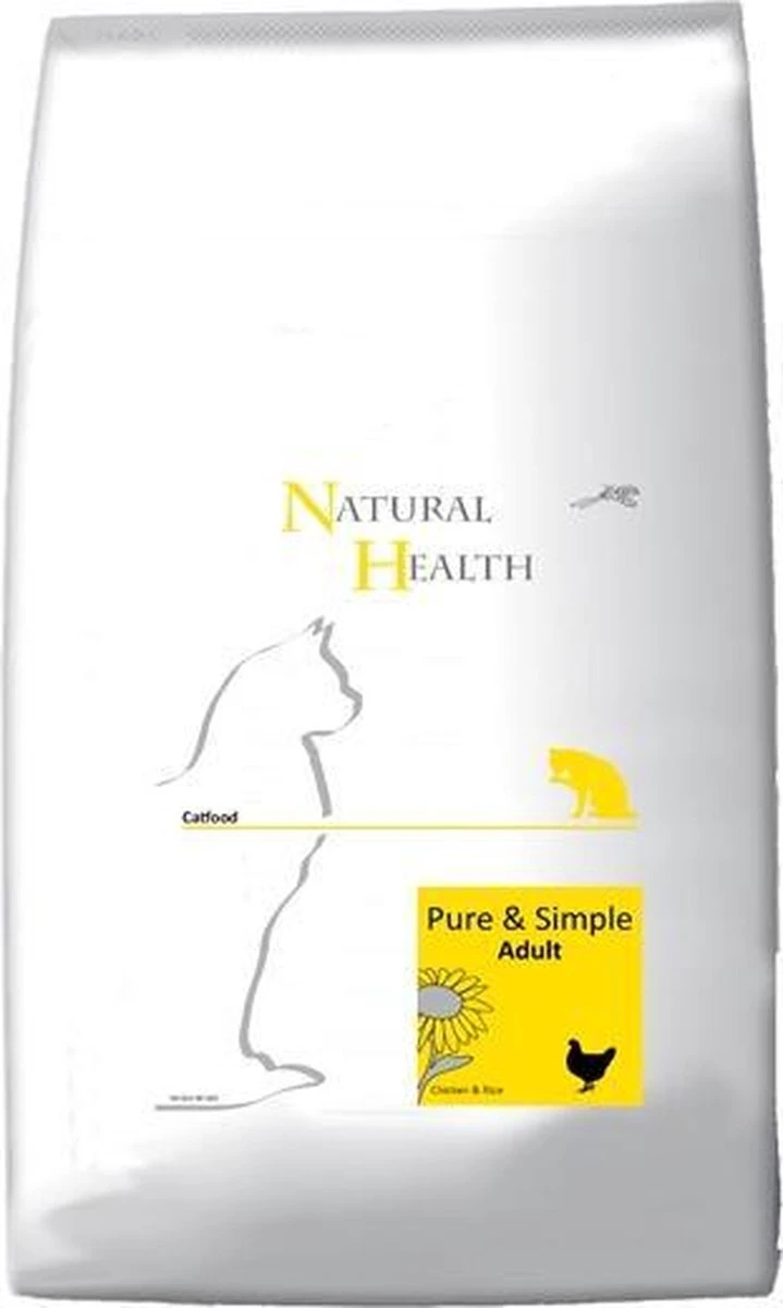 Natural Health kattenvoer Adult Kip is een volledig diervoeder voor volwassen katten van alle rassen. Samenstelling: Gedehydreerde kip 34 %, Bruine rijst 26 %, Witte rijst, Kippenvet, Zonnebloemolie, Lijnzaad, Gehydrolyseerde kippenlever, Zalmolie, Lijnzaadolie. Analytische bestanddelen: Ruw eiwit 28,0 %, Ruw vet 18,0 %, Ruwe celstof 2,9 %, Ruw As 6,5 % Toevoegingsmiddelen: IJzer II sulfaat monohydraat 120 mgMangaan II oxide 49 mgKoper II sulfaat pentahydraat 6 mgZinksulfaat monohydraat 182 mgCalciumjodaat, watervrij 1,2 mgNatriumseleniet 0,2 mgTaurine 900 mgVit A (E672): 20.000 IEVit D3 (E671): 2000 IEVit E: 300 mg Antioxidanten: Sterk tocopherol-houdend extract (vitamine E en C) van natuurlijke oorsprong. Zonder Conserveermiddelen.ME:4013 Kcal/kg