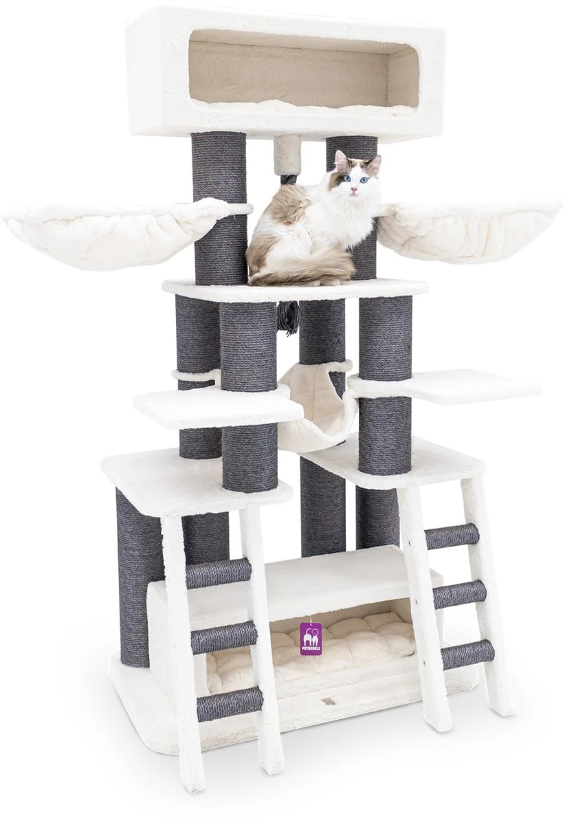 Skybox 187 is het liefste kattenmeubel in ons assortiment. Ze heeft vriendelijke strakke vormen, fluweelzachte kussens en oneindig veel knusse slaapplekjes. Heel aaibaar dus, net als je kat! Maar tegelijk is ze ook robuust en stoer. En ze kan wel tegen een stootje. Dat komt doordat ze een extra dikke bodemplaat heeft en krabstammen van maar liefst 15 centimeter dik. Zoek je een echt kattenkasteel voor jouw prins of prinses? Dan is onze Skybox 187 een supergoede keus!