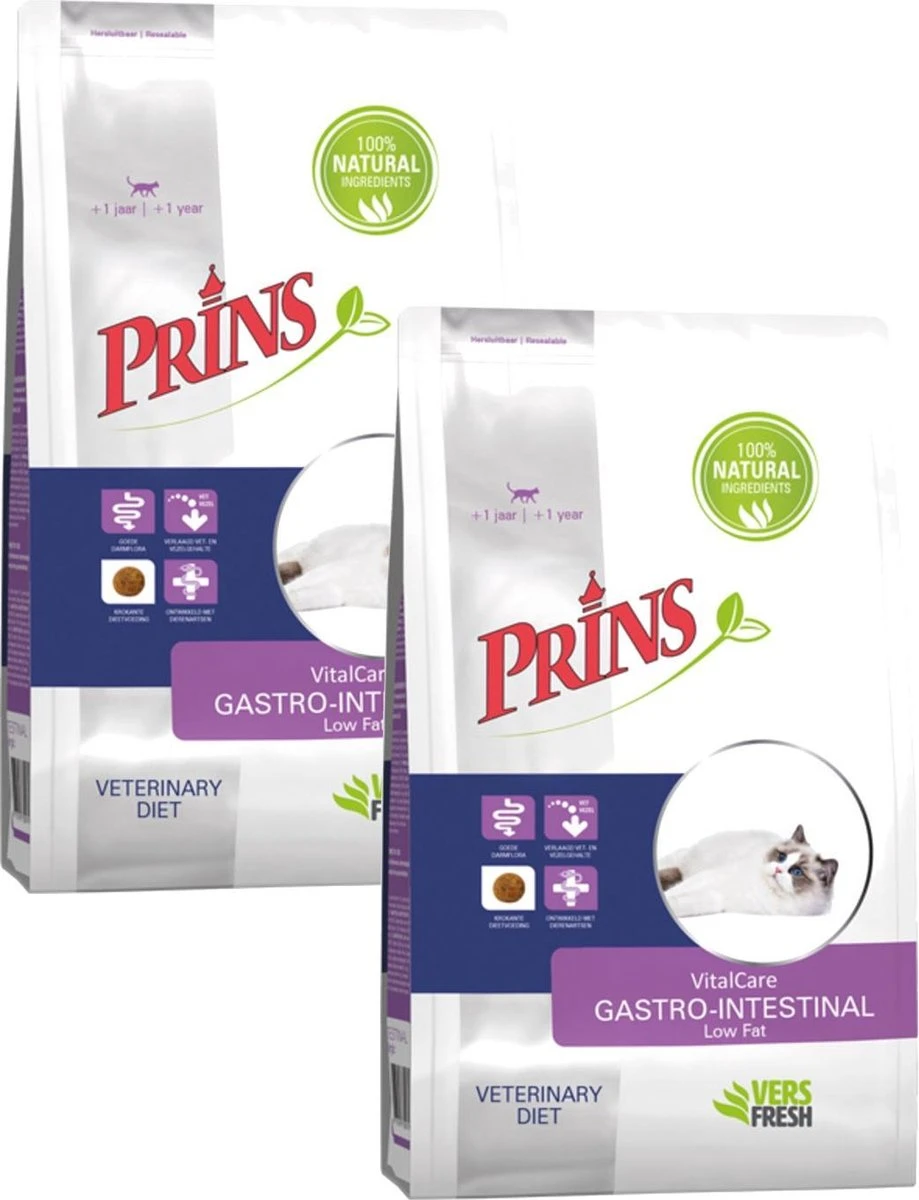 Maagdarmproblemen, zoals diarree of wisselende ontlasting komen vaak voor bij katten. Bij maagdarmklachten is er meestal geen sprake van goed gevormde ontlasting, maar ook spugen wordt regelmatig gezien. Prins VitalCare Veterinary Diet Gastro-Intestinal Low fat, een volledige dieetvoeding voor katten met maag-darmproblemen. Deze voeding bevat een lager vet- en vezelgehalte om de spijsvetering te ondersteunen en om te zorgen voor een licht verteerbare voeding. De voeding is hypoallergeen, wat betekent dat de voeding alleen zalm bevat als dierlijke eiwitbron om de kans op een overgevoeligheidsreactie te verminderen en bevat daarnaast nog extra ingrediΓ«nten voor een evenwichtige darmflora.