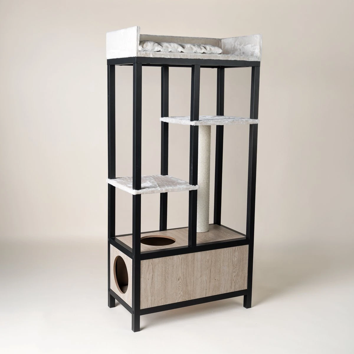 Via de plateaus komt u boven het huisje uit, daar vindt uw kat de sisalpaal van 79cm hoog. Ideaal om goed uit te kunnen strekken en rekken, wat ergonomisch gezien erg belangrijk is voor de gewrichten en gezondheid van uw kat. In het huisje zitten 3 openingen, 2 aan de zijkant en een aan de bovenzijde voor easy acces (voor uw kat, maar ook voor het stofzuigen. Echt aan alles is gedacht!). Ook daar is een heerlijk dik kussen te vinden waar uw katten heerlijk kunnen spelen en schuilen.