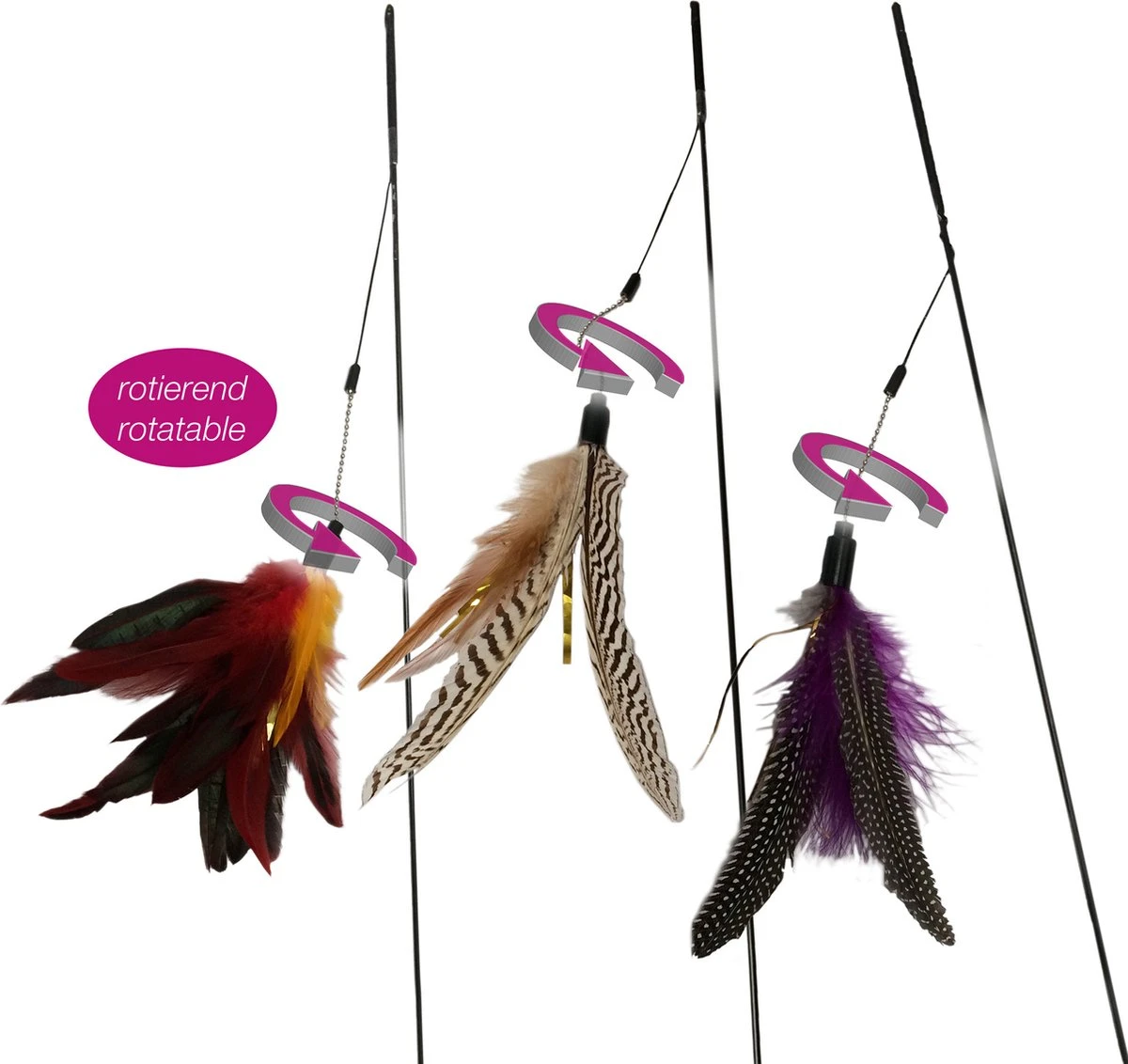 Spelen zit in de aard van de kat, is zeer gunstig voor zijn welzijn en versterkt de band tussen u en uw kat. De speelhengel Flying Bird heeft natuurlijk gekleurde veren, die plezier en opwinding brengen aan uw kat. De draaibare veer geeft de speelstang een bijzondere betovering. De duurzame koolstofvezel en de nylondraad vormen samen een zeer duurzaam product.