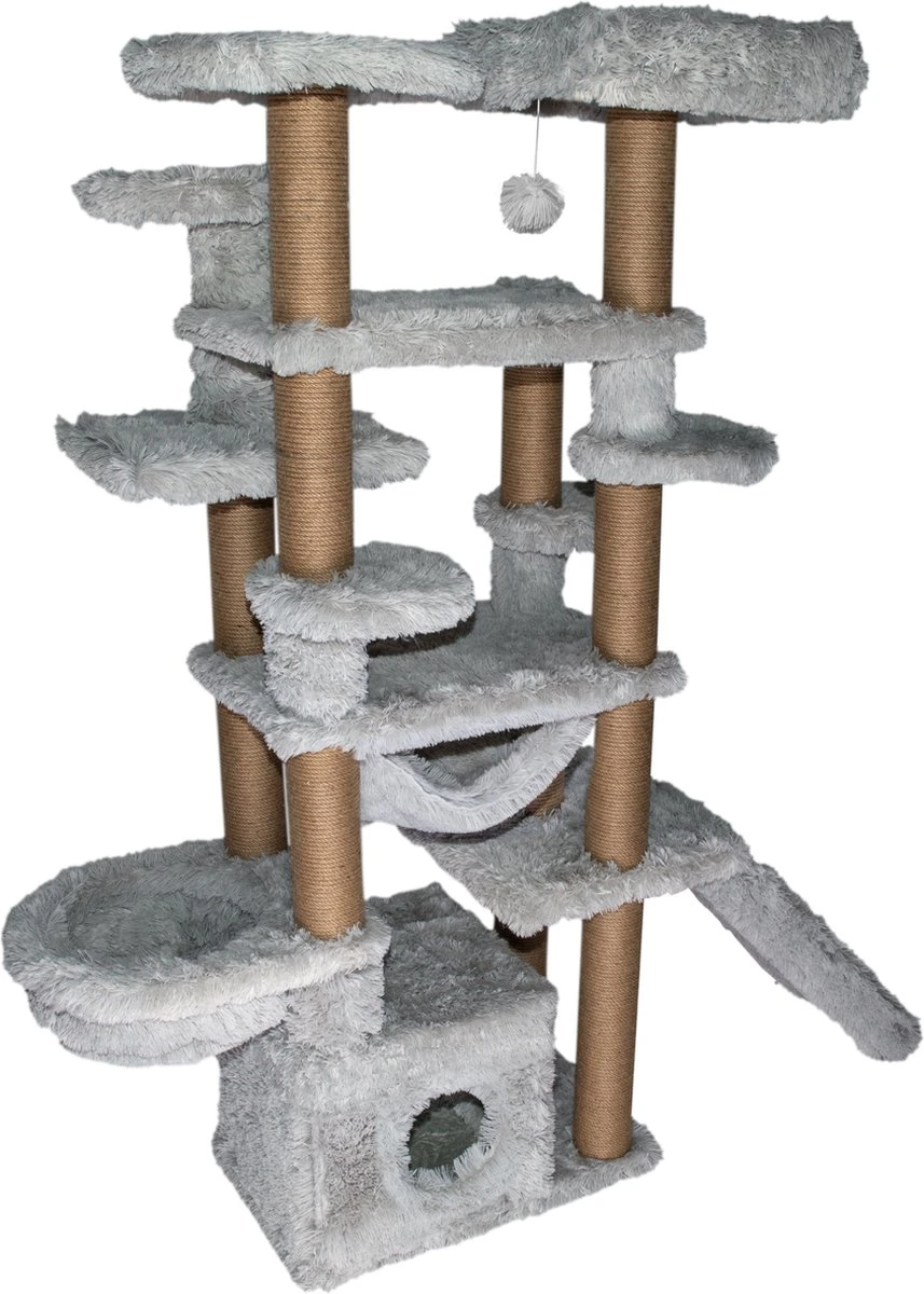 Topmast Krabpaal Fluffy Malta – Grijs – 166 X 65 X 173 Cm – Krabpaal Voor Grote Katten En Zware Katten – Met Kattenhuis En Hangmat – Stevig Sisal Touw
