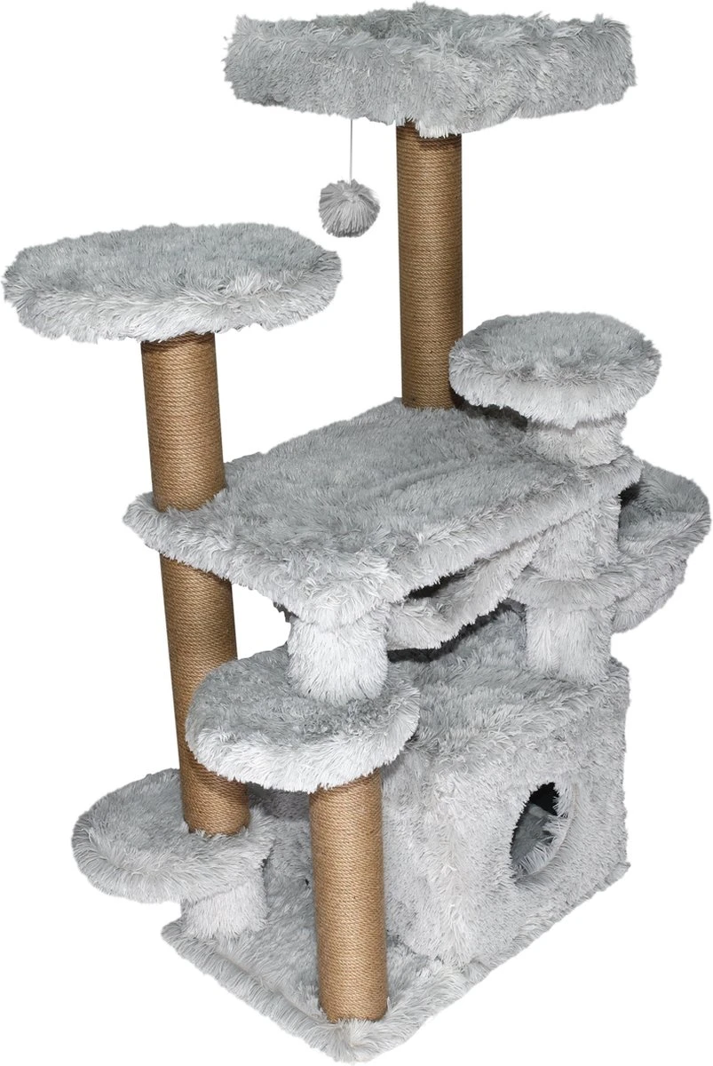Topmast Krabpaal Fluffy Tokyo – Grijs – 108 X 65 X 129 Cm – Krabpaal Voor Grote Katten En Zware Katten – Met Kattenhuis En Hangmat – Stevig Sisal Touw
