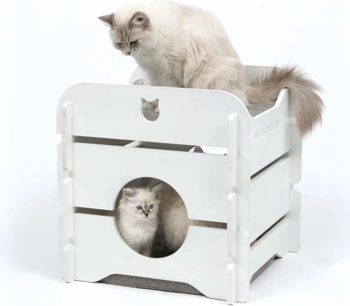 Kubieke meubels voor katten, ziet eruit als een klein romantisch landhuis β Inclusief een gezellige schuilplaats onderaan en een uitkijktoren bovenaan β 2 openingen β Eenvoudige montage zonder gereedschap β Decoraties in de vorm van katten β Comfortabele kussens β Hoogwaardige MDF met laminaatafwerking β 50 x 50 x 49 cm