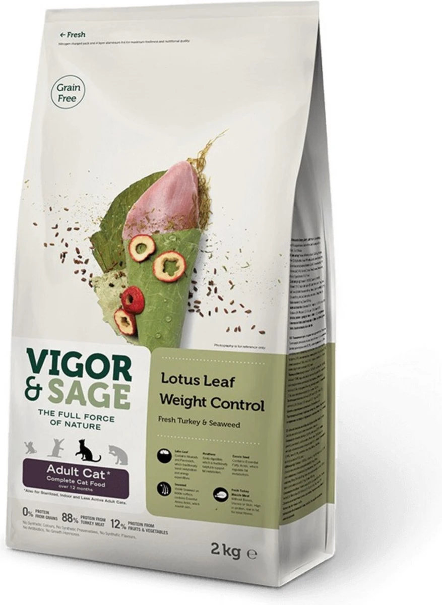 Vigor & Sage Lotus Leaf Weight Control is kattenvoer speciaal ontwikkeld om het gewicht van jouw kat op peil te houden. De kattenbrokken zijn rijk aan vers kalkoenvlees, Zeewier en functionele kruiden. Het voer is speciaal voor katten met overgewicht ouder dan 12 maanden. Ook voor volwassen gesteriliseerde minder actieve katten.