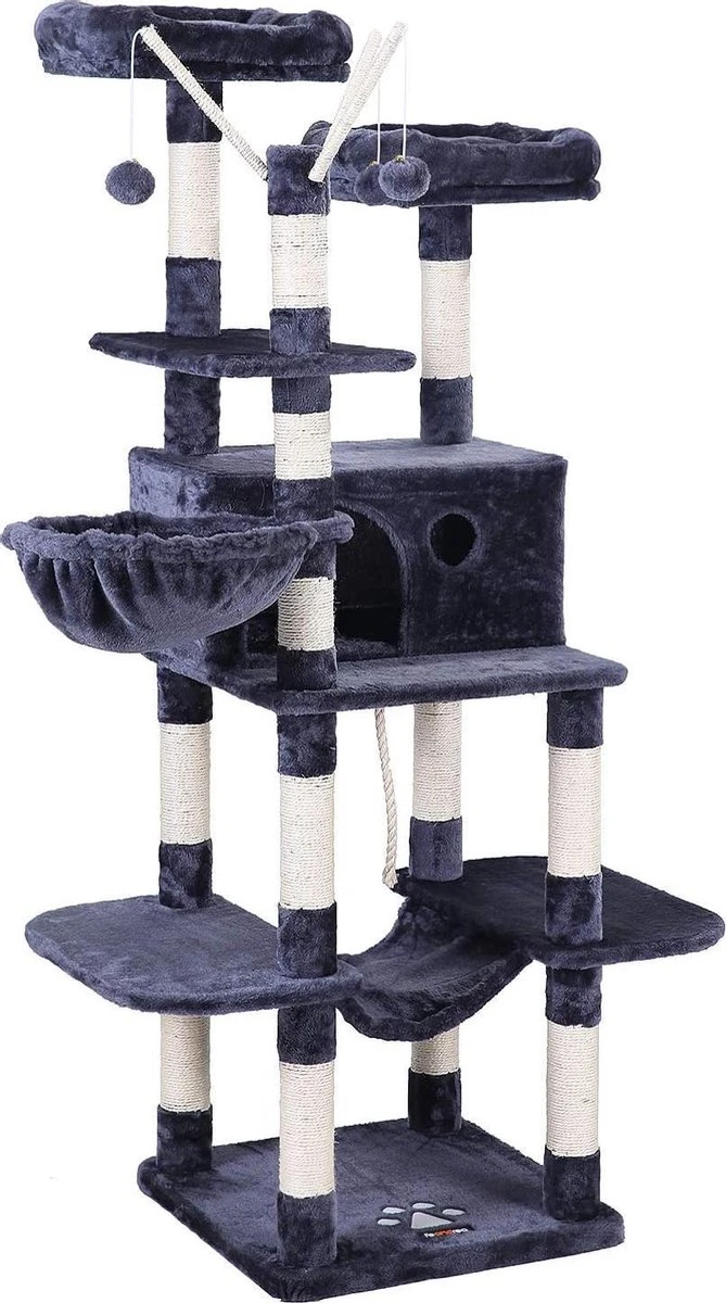 Dutten, ontspannen, rekken, spelen⦠Deze klimboom biedt tal van VIP-diensten aan. Het heeft 2 grote platforms, 1 kattenhuis, 1 hangmat, 1 ligstoel, 3 staven met bontballen en 1 sisaltouw.