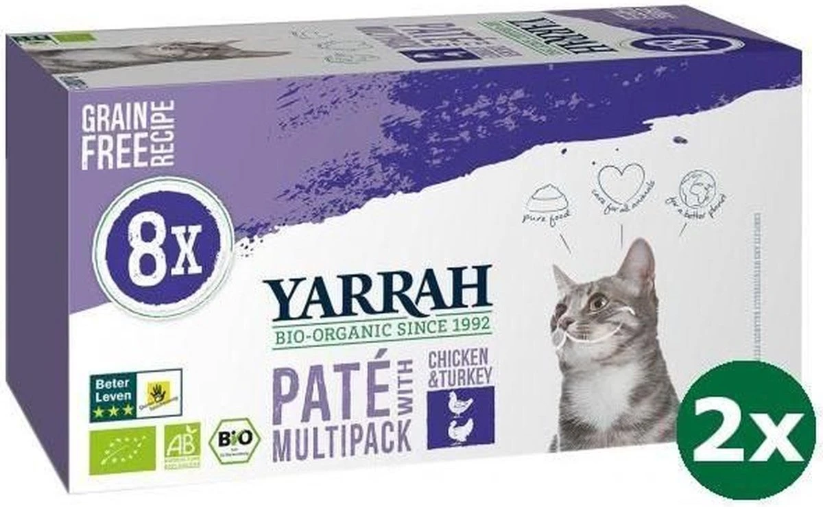 Yarrah Cat Alu Pate Multipack Chicken / Turkey 8 x 100 grYarrah Cat Alu Pate Multipack Chicken / Turkey 8 x 100 gr is graanvrij, volledig kattenvoer, biologisch natvoer met kip en kalkoen en aloë vera, voor een sterk immuunsysteem. Dit smakelijke natvoer is goed voor jouw kat en het milieu. Deze kuipjes zijn gemaakt met biologische kip en kalkoen, die een beter leven hebben gehad en vrij hebben mogen rondlopen. Kip en kalkoen hebben een kleinere ecologische voetadruk dan bijvoorbeeld rund en zijn dus beter voor het milieu! Tevens zijn kip en kalkoen zeer goed verteerbaar en zijn katten er dol op. Ook is er aloë vera aan het voer toegevoegd: zeewier bevat veel vitaminen, mineralen, antioxidanten en enzymen en helpt het immuunsysteem te versterken. Het voer is vrij van kunstmatige toevoegingen én granen! Eén pak bevat 8 kuipjes graanvrij paté en is geschikt voor alle kattenrassen, van alle leeftijden.- Biologisch natvoer voor de kat in handi